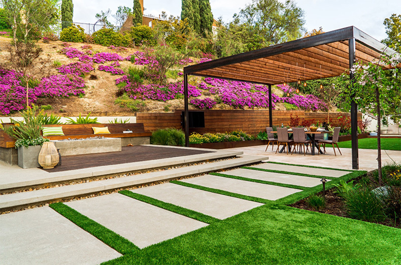 4)花園面積較大,可設計起伏有致的緩坡,這樣設計會讓視線開闊又豐富,但是坡度會加速土壤水分流失,植物維護成本高,建議增加滴灌設備。