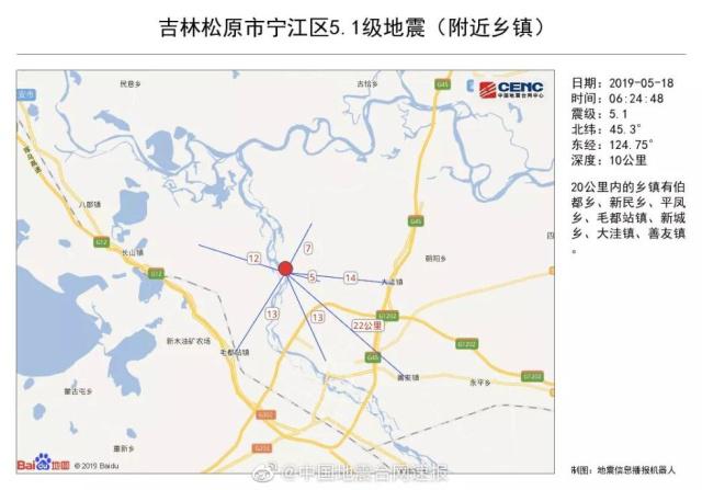 中國地震臺網正式測定:05月18日06時24分在吉林松原市寧江區(北緯45.30度,東經124.75度)發生5.1級地震,震源深度10千米。