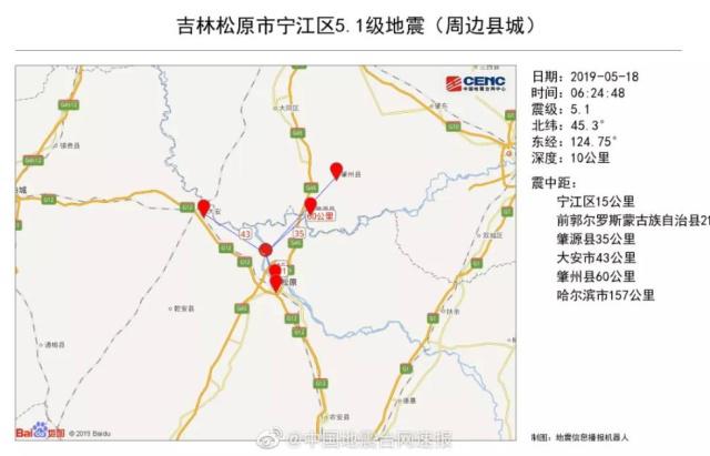 震中距松原市19公里,距哈爾濱市157公里,距長春市171公里。