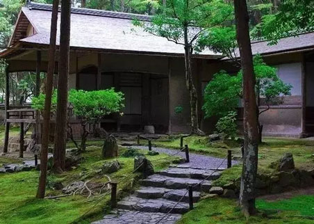 茶庭也叫露地是源自茶道文化的一種園林形式,至今茶庭的景觀作用己大于實用功能。茶庭式園林一般是在進入茶室的一段空間里,按一定路線布置景觀,以拙樸的步石象征崎嶇的山間石徑,以地上的矮松寓指茂盛的森林,以蹲踞式的洗手缽聯想到清冽的山泉,以滄桑厚重的石燈籠來營造和、寂、清、幽的茶道氛圍。有很強的禪宗意境。